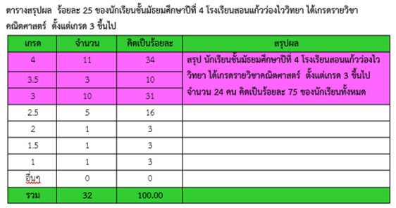 ร้อยละ 25 ของนักเรียนชั้นมัธยมศึกษาปีที่ 4 โรงเรียนสอนแก้วว่องไววิทยา ได้เกรดรายวิชาคณิตศาสตร์ ตั้งแต่เกรด 3 ขึ้นไป